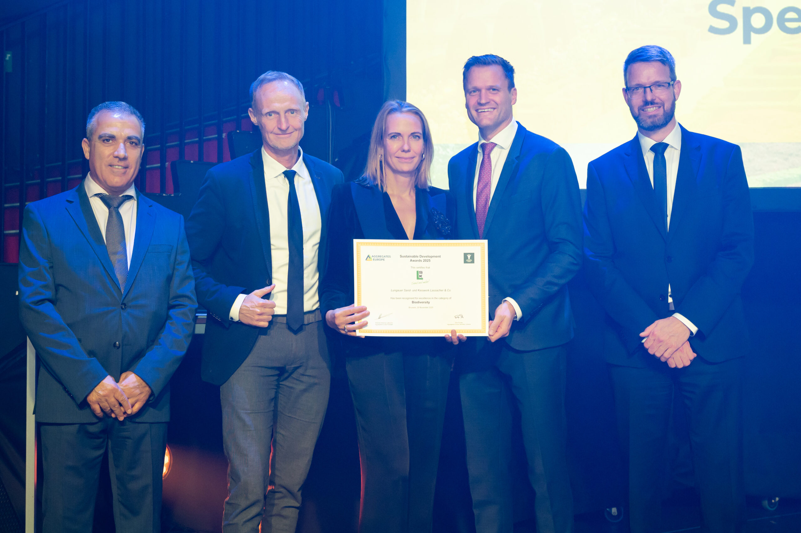 Die „Sustainable Development Awards 2025“ des Europäischen Gesteinsverbands Aggregates Europe wurden am 26. November im Konzertsaal „La Madeleine“ in Brüssel verliehen. Von den 66 eingereichten Projekten aus 16 Ländern erhielten neun Unternehmen eine Trophäe, neun weitere wurden mit einer „Special Mention“ für herausragende Leistungen in den Bereichen Umwelt, sozialer Fortschritt, wirtschaftlicher Beitrag, Kommunikation und Biodiversität geehrt.