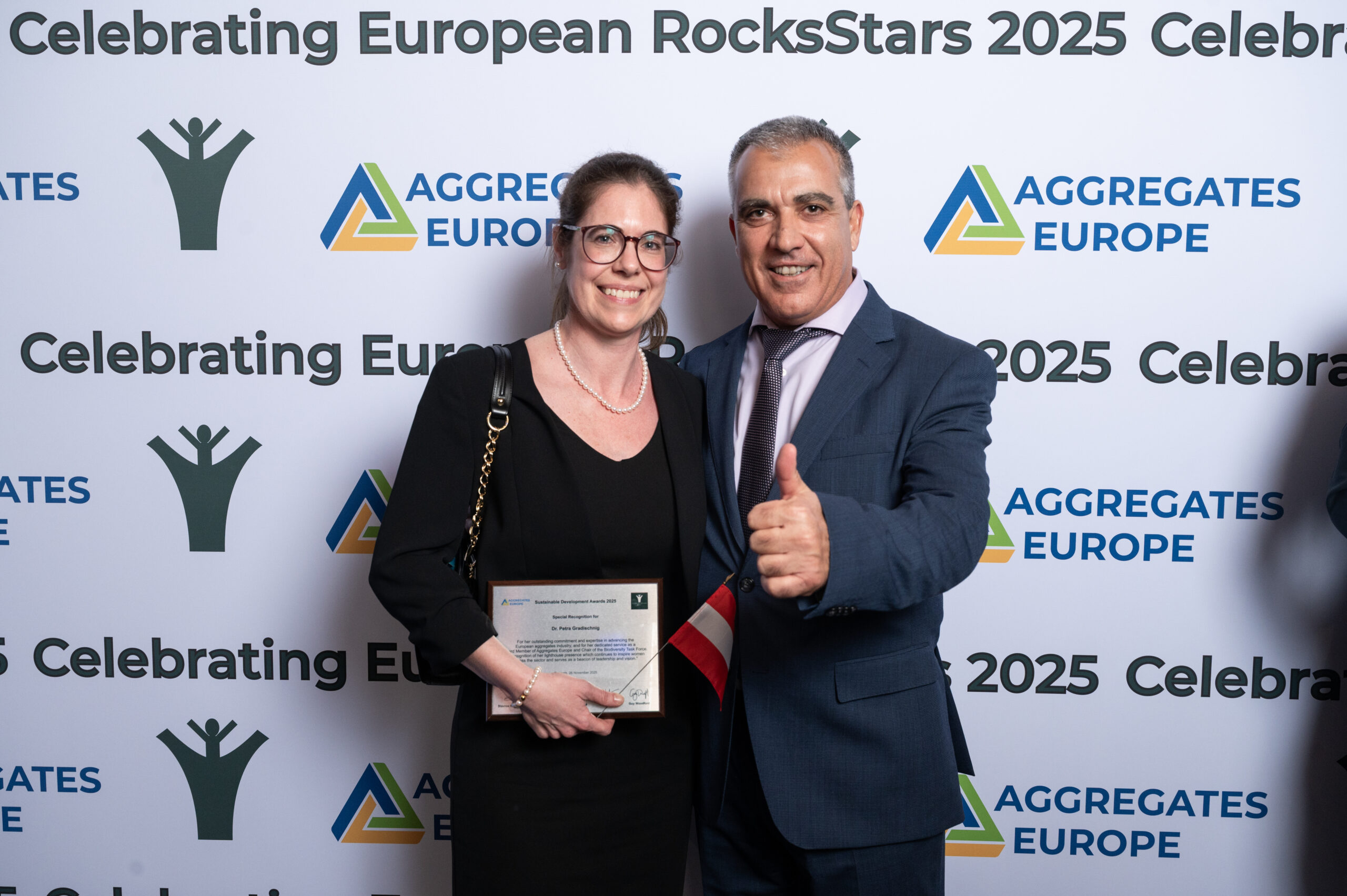 Gleich zweimal ausgezeichnet wurde das Forum mineralische Rohstoffe. Geschäftsführerin Petra Gradischnig erhielt eine Ehrung für ihre herausragenden fachlichen Leistungen in der europäischen Zuschlagstoffindustrie sowie für ihr Engagement bei Aggregates Europe, insbesondere als Leiterin der Task Force Biodiversität.