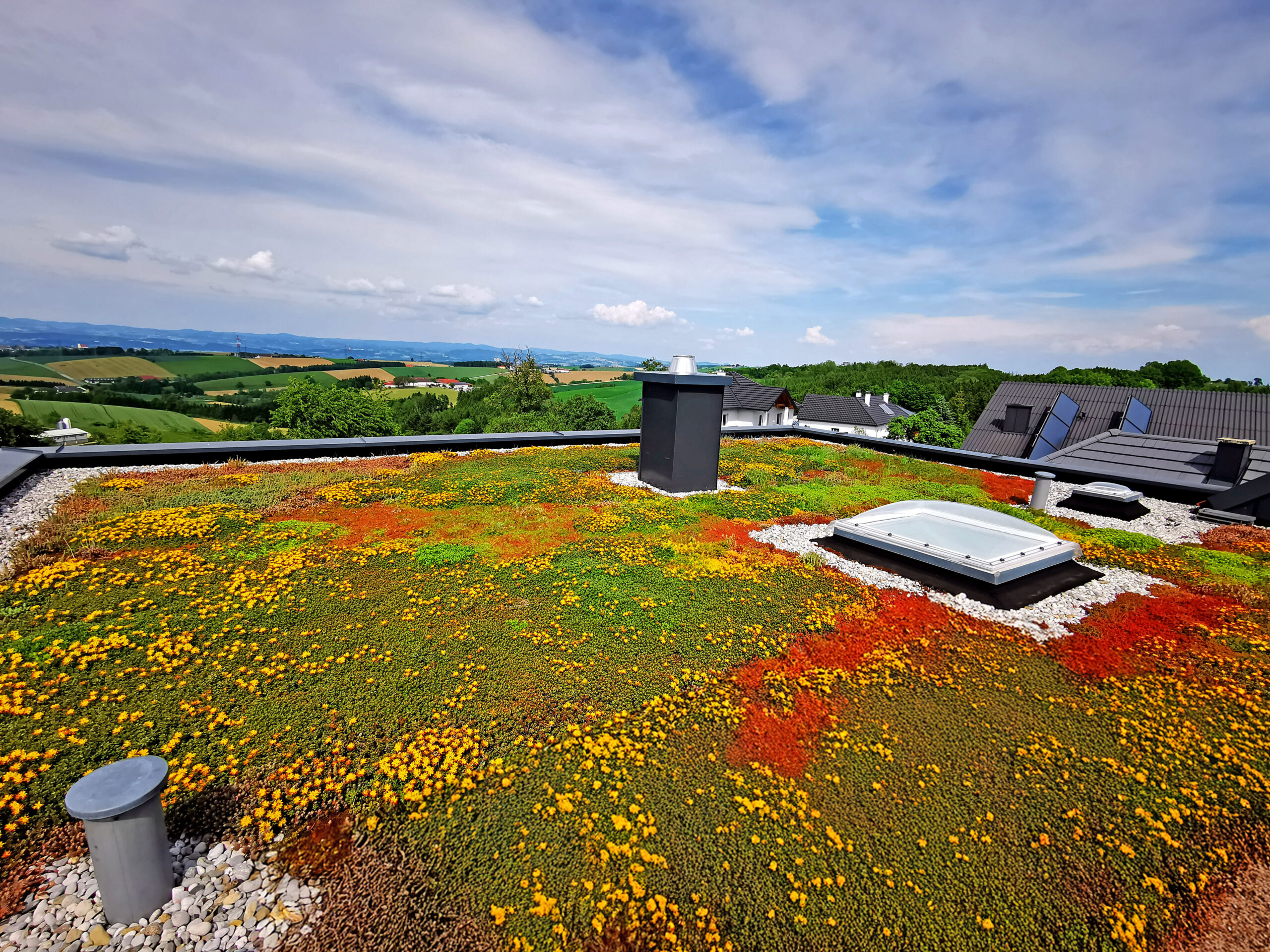 Auch in ländlichen Gebieten leisten begrünte Dächer einen wichtigen Beitrag zur Retention: Sie speichern Regenwasser und geben es über Verdunstung langsam wieder ab. © HAAS Garten-, Dach- und Landschaftsbau GmbH